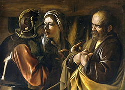 This is the moment that Caravaggio captures in his painting. The servant girl, the accuser, stands in the middle of the painting, just off to the left, next to a soldier brought, presumably, to arrest Peter. Peter stands at the right of the painting, facing slightly toward the viewer. His hands are turned in toward his own body, gesturing at himself in his act of denial. Light from an unseen source somewhere to the left of the painting shines strongly on Peter’s forehead. The soldier is in shadow; his face can barely be seen. The servant girl is partially blocked from the light by the body of the soldier, but a strip of the same light that is falling upon Peter catches her squarely in the eyes. The painting seems to be a straightforward illustration of this biblical scene at a crucial moment. Will Peter be exposed? Will he admit who he really is?