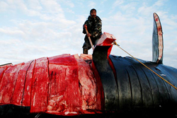 The Nanuq, the boat to which the whale was secured, motored through the night and reached the cove near town where I had tailgated the week before shortly after dawn. The bowhead was moored to three orange buoys on the edge of the bay, where it bobbed, with a long knife called a tuuq stuck in its top, until early afternoon, when the tide lowered. Canoes ferried hungry onlookers to the site and the slicing of maktak began. Naalak Nappaaluk, a revered elder and the only man alive who remembered stories about the bowhead hunts of yesteryear, sat on a rock with a pad of maktak nearby and tears in his eyes. Nappaaluk had a shot at a bowhead as a teen, but it escaped through a lead in the ice. “Today, I have seen people standing on the bowhead for the first time,” he told me through a translator. “It’s overwhelming.” A bulldozer that had intended to flip the whale had trouble making it to the site, and the majority of the meat rotted. When I returned three days later the stench was so potent that men were vomiting uncontrollably.