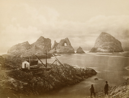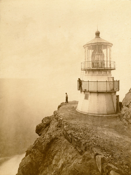 Many of Muybridge’s landscape photographs were government commissions that mixed documentation and propaganda. His series of lighthouses, commissioned in 1871, are stark and exacting. “Pigeon Point Lighthouse” for example, is cut in two by the dark cliffs on the right, the misty water and endless horizon of the ocean on the left. The white tower of the lighthouse rises behind a small white house; the afternoon sun is precise in its carving of shadows on the buildings, making the scene look like a Edward Hopper painting. There are two tiny, feathery figures just to the left of the buildings, standing on the cliff, facing each other. But it is hard to tell. They exist perhaps to show dimensions in the image, to give a sense of proportion between the structures and the horizon. But they are dwarfed by it all.