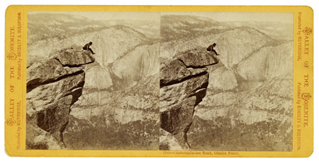 Serene lakes look like polished glass surrounded by expansive hills. Muybridge was fond of grand perspectives, and he knew such images of the frontier were in demand back east. Often he photographed the sides of summits or cliffs from a precarious point, giving us a feeling as if we were the first to see this site — a place untouched by humans. He put us there on a secret mountain trail, glimpsing a panoramic view of a cliff in foreground and the expansive hills lined with steeples of pine trees, fading into a vast immeasurable world of sepia tones.