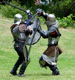 Randrup showed me that games like D&D and World of Warcraft and reenactment groups like the SCA aren’t just fun ways to socialize and feel the rush of battle (whether we swing foam and PVC swords in our mind or on a real-world play battlefield). These experiences actually teach us useful things, and for some players, provide a framework. Games also provide accomplishment and belonging, and in some cases (such as gaming guilds and medieval reenactment societies) rites of passage and codes of honor. Why look to a game for life philosophies? Because our technology-driven ways have forsaken them. Organized religion is corrupt. The world is mundane. And as post-industrial, post-blue collar office workers stuck in our civilized ways, we are effectively paralyzed and chained to our desks and DSL lines, far from Eden, far from nature, far from the magical thinking of yore.