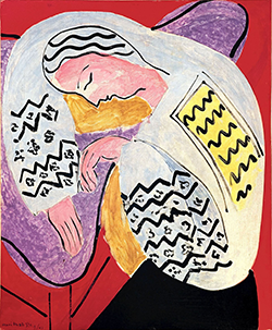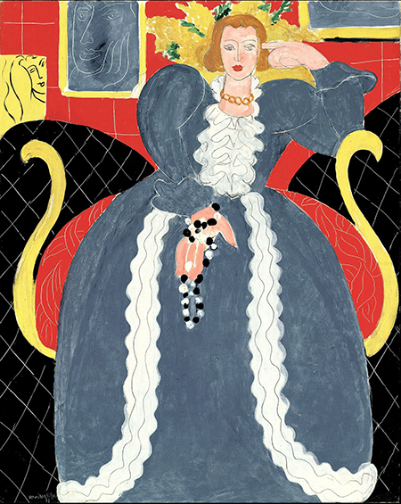 By the 1930s the canvas itself became a dynamic space, for unlike his earlier focus on a series of canvases with a singular subject, he worked with the same canvas, painting and repainting it, scraping paint off from the last session, leaving other paint untouched, each reworking holding some trace of earlier compositions. This is how he composed “The Large Blue Dress” in 1937, painted over several days, each session concluding with a photographic portrait of the canvas take by a photographer who Matisse had hired. Helping him with this process was the model for “The Large Blue Dress,” Lydia Delectorskaya, a Russian émigré who met Matisse in Nice in the early 1930s when she was 22 and he was 62. Matisse hired her to be his wife’s assistant and to help him in his studio. While her presence caused a rupture in Matisse’s marriage (his wife left him in 1939), Delectorskaya would become his consummate model, muse and caretaker for the rest of his life. Throughout the 1940s Matisse and Delectorskaya, who was often his supportive collaborator in the studio, worked together in the painting process in his studio in Nice, almost unaware of the destruction of war that swirled around them. Matisse was not a political artist and his works from the 1940s have few traces of the conflicts of Europe.