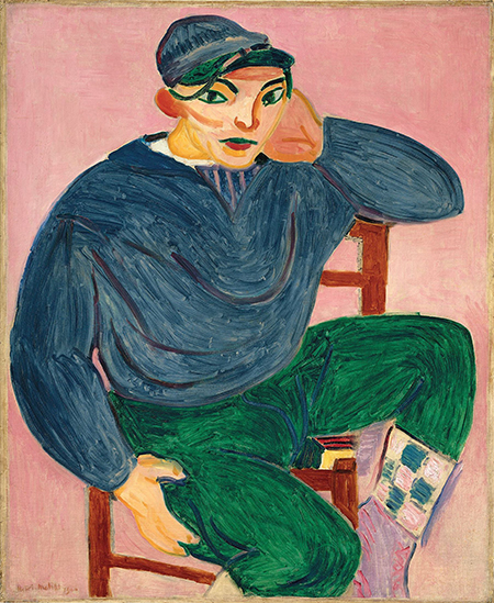 We confront this questioning again and again in this show, as these experiments with color and shape and perspective continue to challenge our sense of Matisse as more than that artist with the colorful collages. Consider “Young Sailor I” and “Young Sailor II,” each done in the south of France in 1906. The first canvas looks more like a sketch of paint, the sailor slouching on a simple chair, torso twisting to the left as he gazes off to the distance. The colors of both the sailor’s clothing and the background are roughly applied in quick brush strokes that reveal the canvas beneath, the body and facial features trimmed in black lines that are meant to give the subject some depth and solidity. The second version destroys the depth of the painting, presenting instead the shape of the sailor’s body defined with dark outlines and contrasting hues of green and blue and pink. The work lacks any sense of light or shadow — the sailor’s body looks nearly like a cut out of color shapes — and transgresses the pictorial perspective that was, in the demands of academic art, so crucial to what makes paint on a canvas a painting.