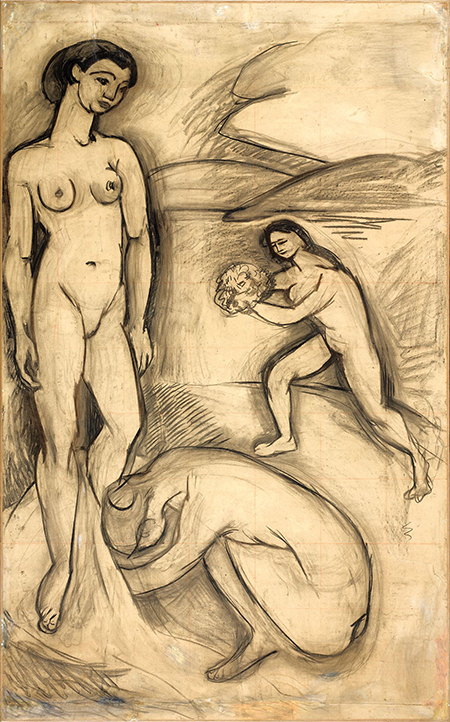 Alongside these paintings hangs a full-sized drawing of the first painting. Matisse commonly did sketches that were as a large as the canvases, believing in the power of the sketch to hold it own force in imaging the painting. Here the sketch serves to preserve the first painting, but also evokes the more reduced sense of depth in the second painting. This copying upon copying, a near obsessive mimetic exploration in the use of shapes and lines, underlines how the subjects of his paintings were increasingly less important than the how the canvas can present and hold the subject. In an interview from 1925, Matisse responded to critics who wondered about his repetitive subject matters arguing that throughout the history of art, painters “went on re-doing the same painting and always differently. After a certain time, Cézanne always painted the same canvas of the ‘Bathers.’” In evoking Cézanne, who he greatly admired, Matisse was aligning himself to a painterly process that emphasized the work of the artists as much as the subjects he created.