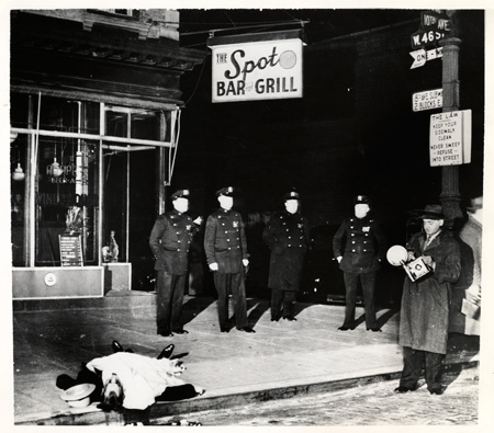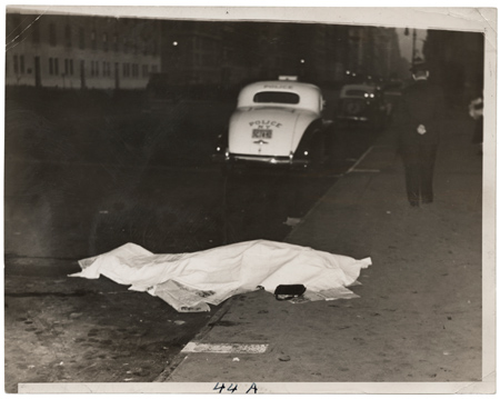 Weegee knew that everything becomes theater in the tabloid press. He captioned his images to fit the dramas. “Balcony Seats at a Murder” presents a long shot of two buildings with their residents huddled on the fire escapes and open windows looking down as long-coated police detectives stand around the entrance to the “Italian Café” in Little Italy. The entrance is blocked by the body of man, his legs stretched onto the sidewalk, half hidden from view.