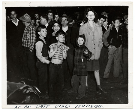 But the bodies of gangland killings are really not what engages us most about Weegee’s “murder” photography. Rather, it’s those photographs of spectators, of those left behind, of family members and neighborhood kids and girlfriends, whose reactions are caught in flat white light in a moment of curiosity or pain. Weegee’s photographs lack a story. They give us a moment, a flash of light with a headline. “At an East Side Murder” captures a standing crowd along the sidewalk opposite from Weegee’s camera.