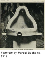 Fountain was one of many ready-mades that Duchamp took from everyday life and placed in a gallery context in order to question not just the beauty and value of art, but also its entire concept. As such his art was known as anti-art, or Dada. Duchamp became legend in his own lifetime, and countless contemporary artists have acknowledged a deep debt to him. His highly conceptual form of art inspired numerous twentieth-century movements, including Pop Art, Minimalism, Op Art, and Conceptual Art. His work exists in a space between painting, sculpture and installation and asks the questions, ‘Who is an artist?’ and ‘What is art?’