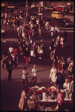Of course, the automobile didn’t ever fully adjust; it carved out a new world to suit itself. Autos flexed their horsepower, and those behind the automotive industry backed a politically savvy team (AAA clubs, city traffic engineers) to clear the roads of people then widen them. The whole idea of jaywalking was created of whole cloth. (For more on this, see “Step Backward, Step Forward.”) Laws were enacted exiling walkers from public rights of way, confining them to designated crosswalks. Outside downtown cores, sidewalks were increasingly neglected on the justification that few now walked, and then nobody walked because there were no sidewalks. When some accommodation had to be made for foot travel, dreary, droogy underpasses and inconvenient, chainlinked pedestrian overpasses were constructed. Those who wandered outside the lines were painted as rogues and criminals.