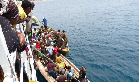 The shouting started immediately as the local boats came into view. When they got close enough their crews threw ropes to Liemba passengers who tied them to the ship’s railings. Then the scramble began.