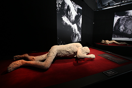 Fiorelli called these plaster casts “calchi” (Rowland names them “plaster ghosts”), which means “plasters” in Italian. These calchi include, “the famous dog; an old man in his underwear wearily shielding his face as he lies down for eternity, too weak to move any farther; a couple embracing as the lapilli bury them.”