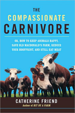 Catherine Friend writes in her new book The Compassionate Carnivore: Or, How to Keep Animals Happy, Save Old MacDonald’s Farm, Reduce Your Hoofprint, and Still Eat Meat: “People who become complete vegetarians for the sake of animals are basically getting up from the table and leaving the room. Although they might work to help better animals’ lives through their words, those words won’t keep a sustainable farmer in business. Only dollars will. If you don’t buy from these farmers, they’ll go out of business, and you’ll have even fewer choices than you do now.”
