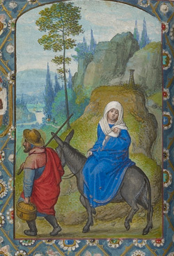 One of the pages of Bening’s Book of Hours on display at the Morgan shows the flight into Egypt. Mary and the infant Jesus ride a donkey while Joseph leads the way. As the curators of the exhibit note, “The miniature also attests to his attention to detail: note, to the right of the Virgin’s head, the tiny gold statue that has toppled from the column on the hill. The idol’s fall symbolizes the collapse of the old pagan world.”