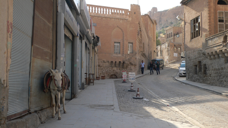 The bazaar branches off from the main street. A passage weaves through it, little light finds its way inside, and the sandy floor is uneven. The shops are stocked solely with products meant to meet day-to-day needs. One of the proprietors is sleeping on a bench in his workshop. The entrance of the Emir hamam beckons; its fascinating interior, which I saw on a previous visit, includes a dome where you can relax after the ordeal. I feel a bit out of place and turn back. Back on the main street, many of the shops offer products targeted to visitors. Mardin is famous for its soaps, which contain a mixture of oils and fragrances. A few shops run by Christians offer tasty red wines made by some Syriac families in the surrounding area. Here and there, craftsmen busily hammer copper or create bracelets and jewelry boxes. A few streets away, two small boys are driving a donkey up the stone steps in an alleyway, hitting him to drive him onward. This cruelty toward an animal disturbs me. Donkeys are still occasionally used here to transport refuse and water, lending the city an almost archaic air.