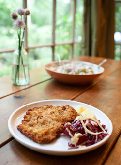 If you do not eat veal, you can still make great schnitzel from pork. In that case, use a tenderloin, and cut it about 1½ to 2 inches thick, then pound it about three times the size. Serve this with the Spring New Potato Salad and Radicchio-Fennel Salad below.