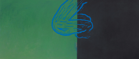 The blue also introduces a horizon, the lighter blue of the sky above the deeper blue of the water. Moving around the room, Vanriet goes with that blue, showing us the way that flavors of blue can divide a canvas just as blue divides the horizon in our own visual experience of the world. If the green and the black are a kind of mythic symbolic division of the world into the primal juxtaposition of life (green) and death (black), the blue shows us basic elemental divisions within the world; up and down, air and water.