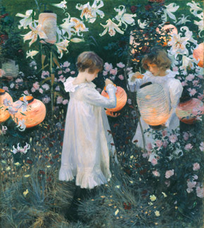Consider the 1840 gallery, a large, airy room displaying paintings from ceiling to eye level, sculptures popping up at different places, at times getting in the way of looking at the paintings. This composition reflects the common 19th century practices of art display, with paintings and sculptures competing for our attention. Look up and find Dante Gabriel Rossetti’s “The Girlhood of Mary Virgin” (1848-9) with its precise details and vibrant colors. Wander down a bit and find John Singer Sargent’s “Carnation, Lily, Lily, Rose” (1885-6) a canvas that radiates with the orange glow of outdoor lanterns on a summer evening, the skillful luminosity carries through to the little girls pinafores and the flutter of lily foliage surrounding them. Turn around and you confront James Whistler’s “Nocturne: Blue and Silver—Chelsea” (1871), a muted vision of the city from the Battersea Bridge looking over the Thames, the paint thick and heavy as it smears across the small canvas, turning the river and landscape into a captivating and hazy abstraction. Each of these works draws on 19th century Aestheticism anchoring an idea of art to the pure beauty of the scene. But in this circuit of images, the paintings float amidst an array of other images, like a kind of online database (as the word “circuit” suggests). In such a display, well-known artists, such as Constable and Turner and Hogarth, mix with the lesser names like Augustus Leopold Egg’s 19th century paintings of social life, or Johan Zoffany’s scenes of colonial India from the late 18th century. This is a gallery experience shaped by digital culture.