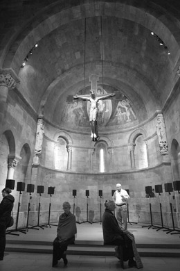 My second trip was on an even bleaker, cloudy December morning. The apse was lighted; the crucifix was glowing. Illumination came from the high windows; the faded wall frescoes supplemented the color of the human costumes. The real illumination came in the form of sound, not light. Reverberations from the speakers bounced around the room itself. Because Cardiff did not mass all the parts of one voice in one place, the timbres are dispersed, creating a more harmonious, organic experience. The voices came both as individuals and in groups: a reedy tenor, a plummy alto, a sonorous bass, the children.