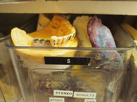 On the last day of the office, when I returned to photograph it, I found myself drawn to the signs and messages written in his hand affixed to the walls, the trays of clay impressions, the shadowy yellowish e-ray films, the photographs of family stuck at odd angles on the file cabinets, the scratches mounting in one man’s hand — but more, a family’s, an epoch’s — on the walls of a stout sturdy building.