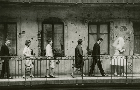 The linearity of the well-dressed party walking single file along a balcony, all framed against a shell-pocked building façade, makes for an unusual wedding photograph. By its title, the photograph asks us to notice the group of people walking between the elegant railing and the damaged building, but all I could see were those rough shell markings. When the photo won a World Press Photo award, it was featured in the German magazine Der Spiegel. The editors noted the façade damage was not from neglect, but rather was the residue of a three-week popular uprising in 1956 that overthrew the government before being defeated by Soviet troops. Nearly 20,000 people were killed. The photograph became symbolic more of the 1956 uprising and its repression than of life in 1965 Budapest. After the Der Speigel publication, Fejes was banned from publishing his photographs in Hungary for several years.