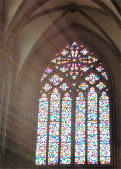 On the return trip from Berlin to Belgium our train was cancelled. Someone had jumped onto the tracks in a successful suicide. We were forced to stay for one night in Cologne. My wife (the unexplainable Shuffy) and I were traveling with our cat. He was dying and needed our care. We stayed up with him late into the night. The light on the great cathedral of Cologne was indescribable that evening; a cloying mist hung on the city that could be felt more than seen. In the morning I took a walk over to the Cathedral and stood in front of the stained glass windows for a little while.