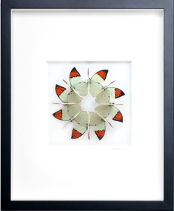 Although the works in this particular exhibit, like “Colure,” are bursting with bright colors, Marley wasn’t always so quick to use his beloved bugs. It seems that he and I share the same original sentiment: he despised insects as a child. He changed his tune once he discovered a use for them beyond the backyard, beyond the classic childhood sun and magnifying glass combination. He integrates a concise yet detailed display of a natural creature in a most unnatural way, which is often why his works are backdropped by graphite or clean white materials. The bugs are the focus; they are all that matters. Of his artistic process, Marley writes on his gallery website: “I needed to take these enigmatic creatures as far as possible out of their natural context, where I had studiously avoided them for so many years.”