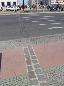 In some places the Wall has simply become a line. A double row of bricks laid into the street marks the former border. As a visitor, it can be confusing to come upon these bricks; you do not know whether to step on them or over them. You find yourself looking down the road to see how far you would have to walk to go around them completely.