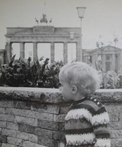 In the beginning, the Wall was made of barbed wire and soldiers. On some streets, cinder blocks had been stacked. In the Neukölln borough, on Harzer Straße, the Wall was about neck-high. East and West Berliners could look at each other over the Wall but they were not allowed to touch. In a photograph taken on the first day, August 13, 1961, two mothers stand on either side of a coil of wire that reaches to their knees. The babies they hold stretch out to each other, inches of air between their fingers. There seems to be a magnetic repulsion preventing them from holding hands. In another picture from that day, a young man in a crowd stands across from two border guards; a chest-high stack of cement is separating them. The young man appears to be asking one guard a question — both lay their hands on the Wall. Their hands are almost touching. The second guard smiles and leans upon the Wall as if he were socializing at a pub.
