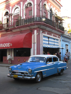 Yuca and his “business partner,” Carlitos, were younger than the usual maquina drivers. Their 1950s Chevy was nicer, too, than the average maquina: shiny lavender exterior, smooth cream-colored, faux-leather seat in the front, a stereo that flashed red and blue lights. Something like what James Dean might drive if he were a young Cuban today. They hadn’t reupholstered the back seat yet, and it was still a dirty, greenish hue, the vinyl roping along the edges broken and scratchy. It snagged on girls’ skirts and grocery bags. They had their music turned up high when I hopped in; they listened to a mixed CD of reggaeton interspersed with Marc Anthony and Enrique Iglesias. Skinny Carlitos collected the money from passengers while chubby Yuca took care of driving. Carlos spied someone trying to wave them down and Yuca eased the car to soft stops without interrupting his soft, tone-deaf whistling. They seemed like a taxi-driving dream team, ready for anything.