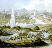 Hadrosaurus was found in the U.S., but that change began in Europe. In the early part of the 19th century, fossil evidence of large, lizard-like creatures not found in the contemporary world began to appear there. Interest in what naturalist (and anti-evolutionist) Richard Owen described in 1841 as “dinosaurs” grew rapidly. When the Crystal Palace of Britain’s Great Exhibition was relocated to be the centerpiece of new pleasure gardens in south London, Owen (as scientific adviser to the gardens) hired noted wildlife artist Benjamin Waterhouse Hawkins to create sculptures of the great beasts for display among the gardens — objects of wonder, to be sure, but also proof of divine majesty. As historian Robert M. Peck notes in All in the Bones, the artist’s charge was, in Hawkins’ own words, “to call up from the abyss of time and from the depths of the earth, those vast forms and gigantic beasts which the Almighty Creator designed with fitness to inhabit and precede us in possession of this part of the earth called Great Britain.”