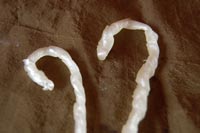 1 cup sugar Cook the first four ingredients over medium heat, stirring occasionally, until a candy thermometer reads between 260 and 285 degrees. Remove the candy from the heat and stir in the extract, then pour the candy onto a well-oiled, heat-safe surface (I used a glass heat pad). Using a metal or silicone spatula, push around the candy until it becomes difficult to work. Then, with oiled hands, carefully (the candy is still quite hot) roll the candy, doubling it over, and roll it again. When the candy is opaque and just barely pliable, roll it thin, cut it into sections as long as you’d like, and round the ends into canes. Place on wax paper to harden. |
