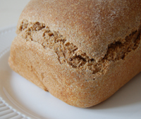 2 3/4 cups warm water2 packets of yeast 1/3 cups honey 1/3 cups olive oil 2 T molasses tsp salt 7 1/2 cups freshly ground hard red wheat flour (can also use regular whole wheat flour) Combine the yeast, warm water, and honey; proof the yeast by waiting for it to bubble. Once it has done so, add the oil, molasses, salt, and 1 cup of the flour. Stir. Add the rest of the flour a cup at a time, stirring it in. Turn the dough onto a large floured cutting board or countertop and knead until smooth, approximately 8 minutes. Put the dough in an oiled bowl; flip the dough to make sure it’s completely covered in oil. Cover with plastic wrap and let rise until doubled. Once doubled, punch the dough down. Separate into two halves, form into loaves, and place in greased loaf pans. Pre-heat the oven to 350 degrees F. Cover the loaves with plastic wrap and let rise. When doubled, place the loaves in the oven and cook for approximately 45 minutes, until loaves sound hollow when tapped. Cool on a wire rack. |