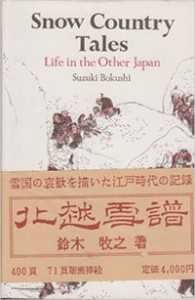Before the arrival of modern technology, this region was really in a world of its own: a microcosm of a winter wonderland, where the logic of winter was played out to the extreme. We know about all of this thanks to the report of Suzuki Bokushi, a Japanese merchant who knew the Niigata region (formerly the historical region of Echigo) in the 1830’s. More than a mere travel report, it is a participant-observer ethnographic study in the full sense, even before the scientific discipline of ethnography was properly established. Bokushi’s book was published (in Japanese) in 1835 as Hokuetsu Seppu, or Snow Country Tales. As he writes, he was actually buried under the snow when he began to compose his book.