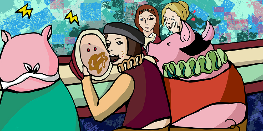 Unlike other manuals on how to behave in public that were written for privileged classes of people — knights, nobles, diplomats, ladies — della Casa’s purpose was to educate ordinary people about such everyday activities as posture, dress, table manners, conversation, even how to tell jokes and when they’re appropriate or not. Lest we think his concerns comically out of date, most of us have had the experience of dining with someone who is wolfing his food down as if it were his last meal, eyes never leaving the plate, hand moving food to his mouth like a backhoe shoveling soil into a truck. Della Casa calls out the same repulsive behavior in his contemporaries: “Do not gnaw or chew such that you hear the sound or noises, since there is a difference between the eating of men and pigs. We must also be careful not to gobble up our food and occasion a hiccup or some other unpleasant result, as happens with people who hurry and so gasp for air or breathe so heavily that they annoy their companions.”