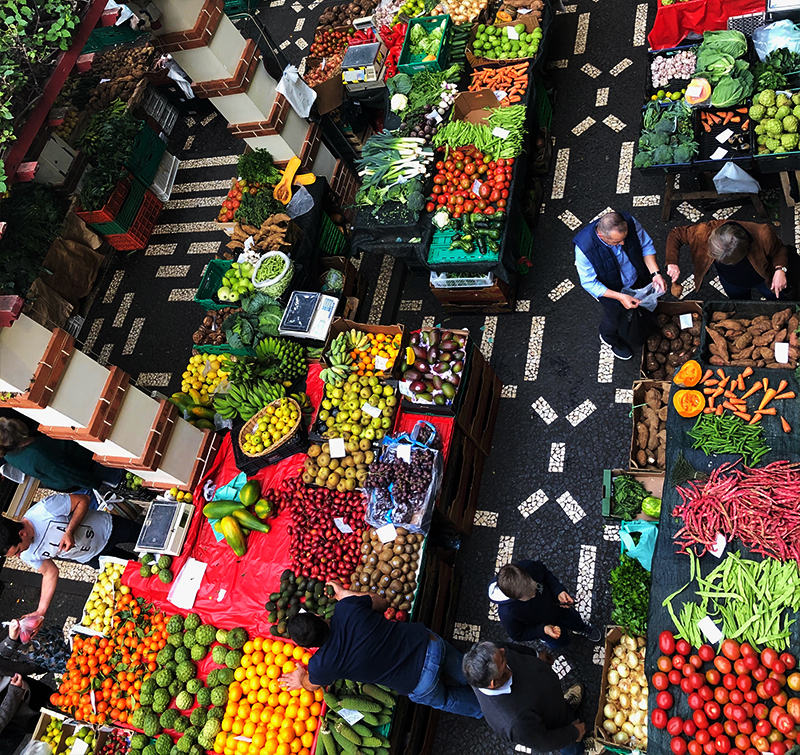 They can’t export their bananas because of EU strangulation, so the place to get them is at the town’s famous market, the “Mercado dos Lavradores,” where samples of many fruits including prickly pears, loquats, pawpaws, and durians were sliced and popped onto my clenched palm to taste, as well as four types of passion fruit, three of which I had never had before: the orange, the tomato, and the banana, the last being truly succulent and delicious.