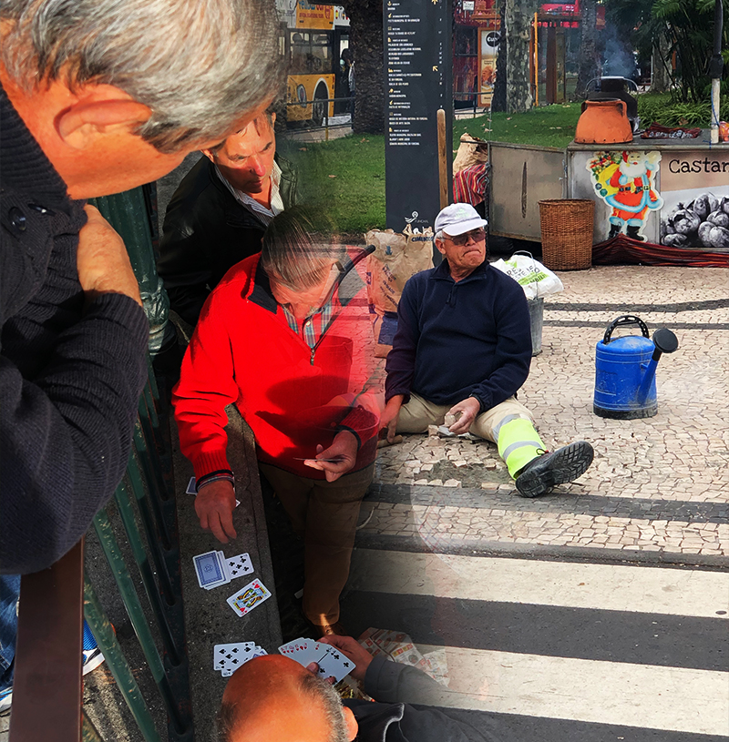 As for the locals, they exude peacefulness as open, easygoing, and mellow people. They have many preoccupations like huddling around a café wall to gamble at cards with an urgency suggesting a more sinister convocation. And in the old photos of Madeira, I was drawn to one titled The “Mergulhança” (diving), which depicts “bomboteiros,” local boys diving for coins that were thrown to them by tourists from the cruise liners of the ’50s. As for specialist occupations, street cobblers tidy the mosaic paving made from the island’s volcanic stone, embroidery is made by women called “bordadeiras,” wicker is fashioned in the nearby village of Camacha, and tobogganists have their own ritual.
