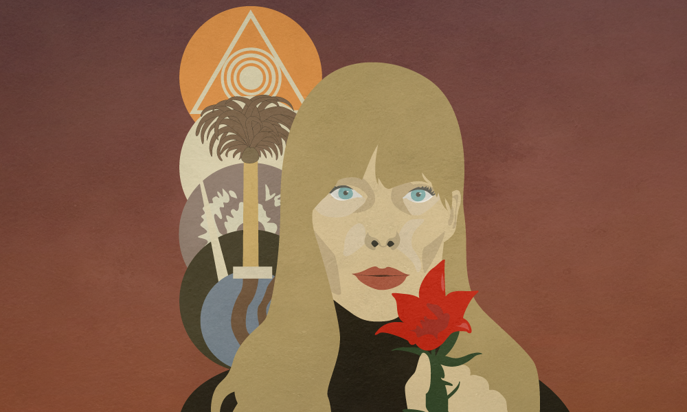 Though Joni Mitchell’s voice has often been called glorious, innocent, and pure, Clouds is not just the songs it contains; It is an aesthetic object, and with its simmering pastel incarnation of the flaxen performer on the album cover, red-flowered and black turtle-necked and golden-tressed, with a sun-hued city in the background (or is it a coastal castle, like something out of Malick’s To The Wonder ?), the record sleeve radiates a classic folk-rock Laurel Canyon vibe; it is an authentic, late-’60s objet d’arte. Mitchell painted the cover art herself, and so it is also a self-portrait, much like Malick’s film, which alludes to the director’s roots in audacious snippets of Midwestern iconography arranged in jarring and unambiguous contrast to the L.A-fixated film as a whole. On Clouds, Joni Mitchell espoused the truth that to be human is to be fleeting (on the album cover, the “m” in her last name is notably lowercased). The lyrics to “Roses Blue,” in particular, haunt almost every corner of Malick’s film, as his is a world of signs and seasons, sorrow and self-pity. Like Mitchell’s song, it has the priestess and the black spells, the zodiac and zen, a protagonist in diminishment and deliquescence, everything right down to the tarot cards and death.