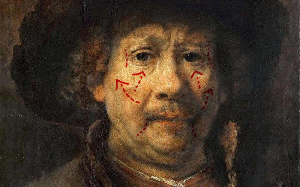 There is something unexpectedly humanist about a 21st-century textbook for plastic surgeons shoring up its technical discussion with a series of oils on canvas from nearly 400 years ago. “Same as it ever was,” the authors seem to be saying, as Rembrandt van Rijn’s dark, liquid eyes gaze steadily at us, even as the face they look out from coarsens and creases, growing ever more distant from the initial downy cheeks of youth. Rembrandt himself was endlessly fascinated by the human face. While he painted other objects without preparation or study, he might sketch a face ten different ways before putting it on canvas. He had learned from da Vinci that the character of a face is expressed less in its innate shape than in its movements—and that, even when it’s not animated, the face retains the history of the emotions that have passed over it in the lines and creases that expression leaves behind. It was his own face, over time, that he depicted more than any other. From 1626 until his death in 1669, over 90 sketches, etchings, and paintings of his own face appear. Rembrandt, in effect, recorded the history of his face, attending each year to its minute changes — the permanent furrowing of the brow, the lines etched from nostrils to mouth, the mottled skin beneath his eyes — tracing its mysterious but inevitable transformation. I imagine that Rembrandt spent a great deal of time scrutinizing the lines and furrows on his own and others’ faces.