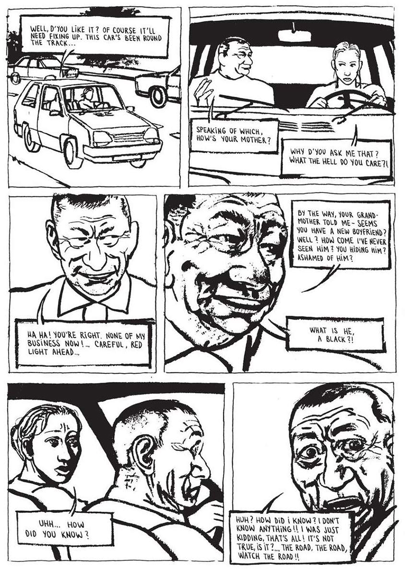 These two men are Alain and Mario, respectively, the two central figures in the book’s title story. This pair of images might suggest that within lies an overly simplistic story of racial animus, but “Yellow Negroes” (or “Negres Jaunes” in French) is far more complex and haunting than that fleeting impression would suggest. The story has long been regarded as a masterwork in Europe, one of the seminal French comics of the 1990s. Now it’s available in English for the first time, and, despite the considerable span of years and cultures, it — along with the other stories in this slim volume — remains as trenchant and relevant as when it was first published.